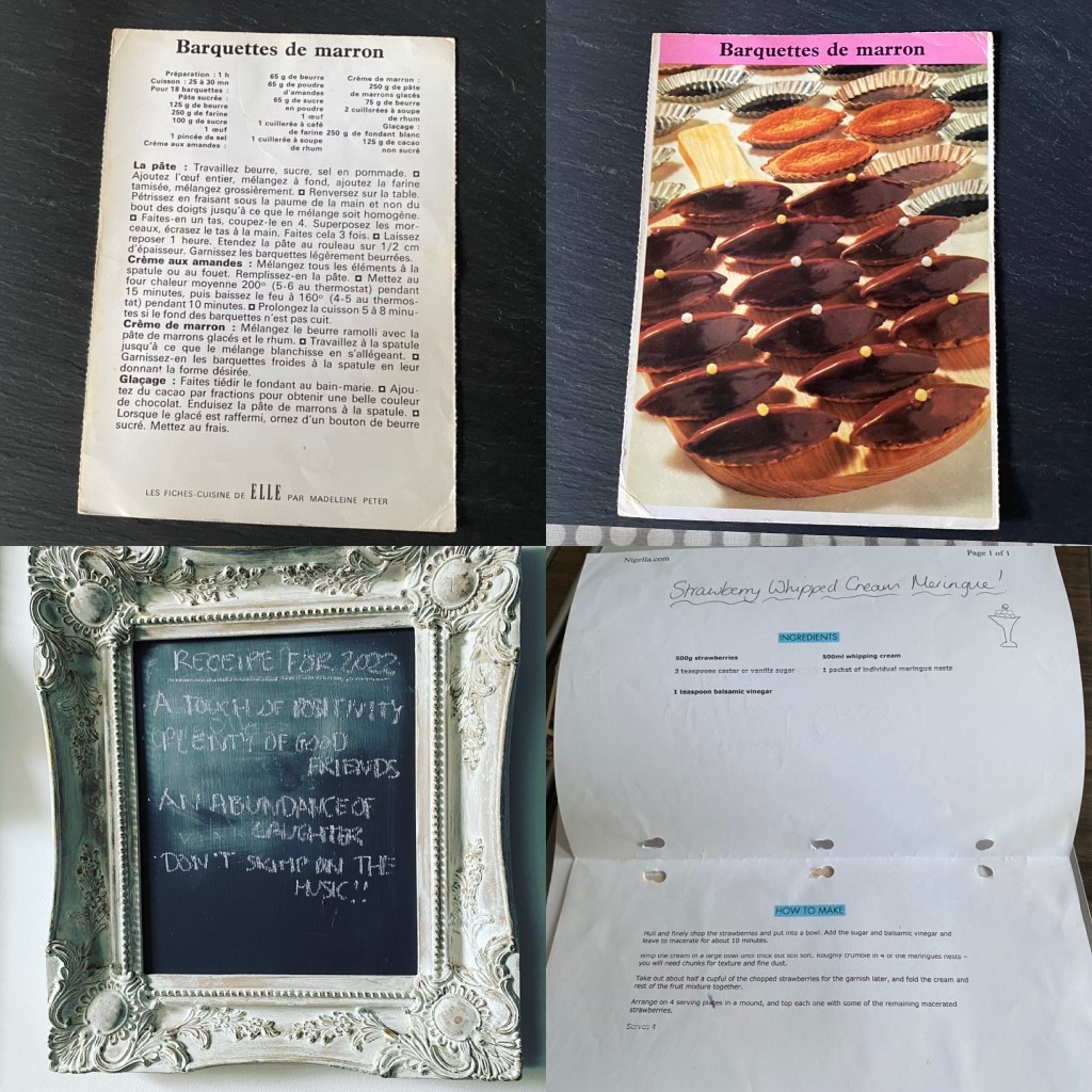 Alt text: a montage of 4 photos – top LH is a cut out recipe from ‘Elle’ magazine (a French edition); top RH is the accompanying photo for the recipe of little cakes decorated with chocolate icing & each has a single yellow ball on top; bottom LH is a photo of a poem written on a blackboard about creating a recipe for 2022 “A touch of positivity, plenty of good friends, an abundance of laughter, don’t skimp on the music!!!” & bottom RH is a recipe for Strawberry Whipped Cream Meringues printed out from the internet.