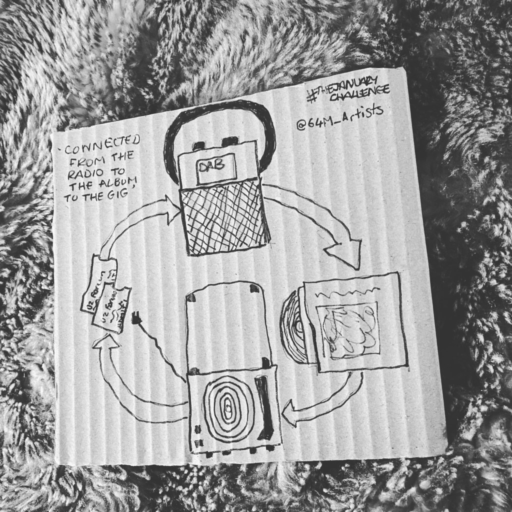 Alt text: The image is also the cover photo for this blog – a piece of corrugated cardboard roughly cut into a square.  There are four images drawn in black felt tip pen connected by directional arrows – a DAB Radio, a vinyl album, a turntable and two gig tickets.