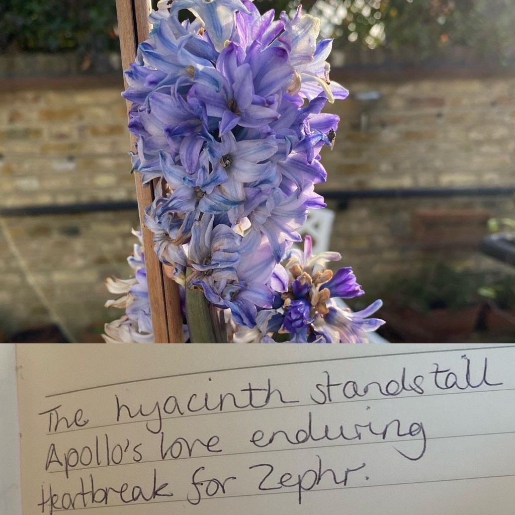 Alt text: a montage of two photos – top: a blue hyacinth in full flower stands on a white metal table, outside in the garden; bottom: white lined paper with a haiku (Japanese-style short poem) written in blue biro – “The hyacinth stands tall, Apollo’s love enduring, Heartbreak for Zephr.”
