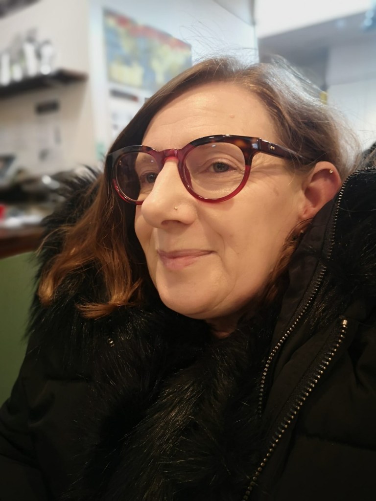 Alt Text: A middle-aged white woman with brown / blond flecked with grey, cut into a bob. She is wearing round pink/brown glasses, a thick, black padded outdoor coat with zips & lined with black faux fur, & a black faux fur scarf. She has a small, diamante nose piercing & a small, diamonte ear cartilage piercing. She is looking away from the camera, smiling. She is in a cafe.