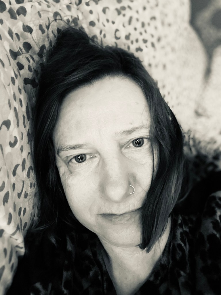 Alt Text: A black & white selfie pose of a white, middle-aged woman, with a bob-style hair cut, wearing a nose ring & a leopard-print pyjama top, resting her head on a pillow case with a dot style print.  She looks exhausted.