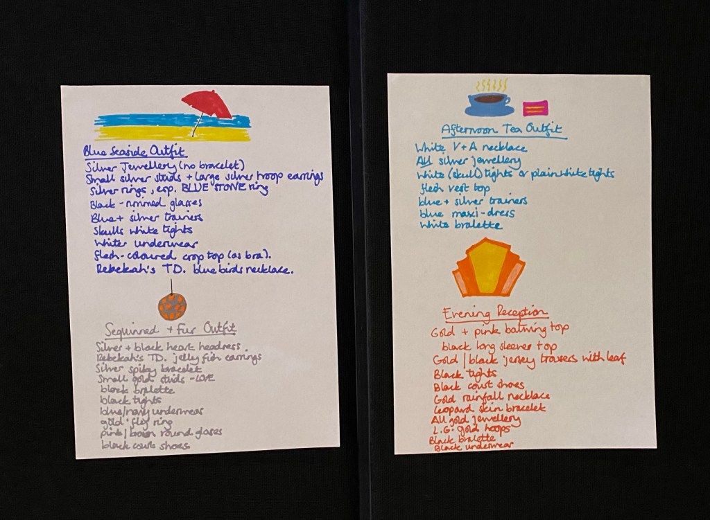 Alt Text: Two white A4 pages stuck side by side, on a black curtain, with a list of outfits, accessories & little doodles on them, drawn with felt pens. Page 1 – a doodle of a red parasol stuck in a strip of yellow sand, with a strip of blue sea above it. The text says – Blue Seaside Outfit – Silver jewellery (no bracelet), small silver studs & large silver hoop earrings, silver rings, esp. Blue stone ring, black rimmed glasses, blue & silver trainers, skulls white tights, whiter underwear, flesh-coloured crop top (as bra), Rebekah’s TD blue birds necklace. The next list has a doodle of a disco ball in silver & gold. The text says – Sequinned & Fur Outfit – Silver & black heart headdress, Rebekah’s TD jellyfish earrings, silver spiky bracelet, small gold stud – LOVE – black bralette, black tights, blue/navy underwear, gold ‘fly’ ring, pink/brown round glasses, black court shoes. Page 2 – a doodle of a tea in a blue cup & saucer next to a slice of pink cake with yellow buttercream. The text says – Afternoon Tea Outfit – white V & A necklace, all silver jewellery, white (skull) tights or plain white tights, flesh vest top, blue & silver trainers, blue maxi-dress, white bralette. Then a doodle in orange, yellow & light pink colour of an art deco mirror. The text says – Evening Reception – Gold & pink batwing top, black long sleeve top, gold/black jersey trousers with leaf, black tights, black court shoes, gold rainfall necklace, leopard skin bracelet, all gold jewellery, L.G. gold hoops, black bralette, black underwear.