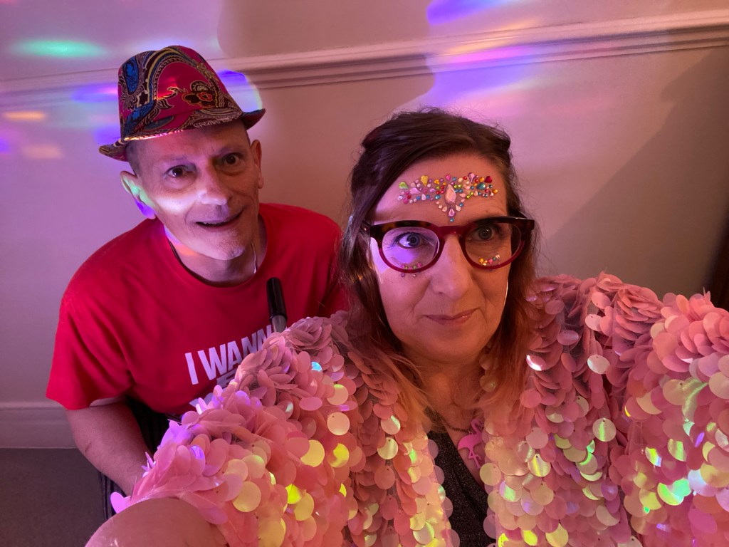 Alt Text: A selfie pose of an older white man & woman, in front of a white wall. Pale disco lights reflect on the wall, their clothes & their faces. The woman is in a wheelchair & she has long brown/blond/grey hair, some of which is tied back. She wears pink/brown round glasses, face jewelry, large silver hoop earrings, a necklace with a pink flamingo, a silver top & a cape made of plastic, translucent pink discs. The man is crouching behind her. He wears a muti-coloured trilby hat, a red t-shirt with a slogan in white lettering that says “I wanna…” & black & grey stripy trousers.