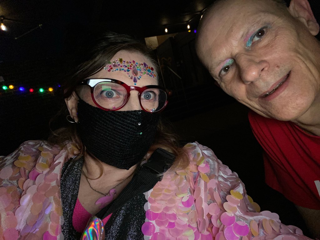 Alt Text: A selfie pose of an older white man & a white woman in a dark club. The woman has brown/blond/ grey long hair, some of which is tied back, & she is wearing rainbow-coloured face jewelry, silver hoop earrings, a black sequinned mask, a necklace with a pink flamingo, a cape with plastic pink, translucent discs, a silver top with a pink top underneath & a translucent-coloured bum bag. The man is bald & he has bright blue & pink eyeshadow on. He is wearing a red t-shirt.