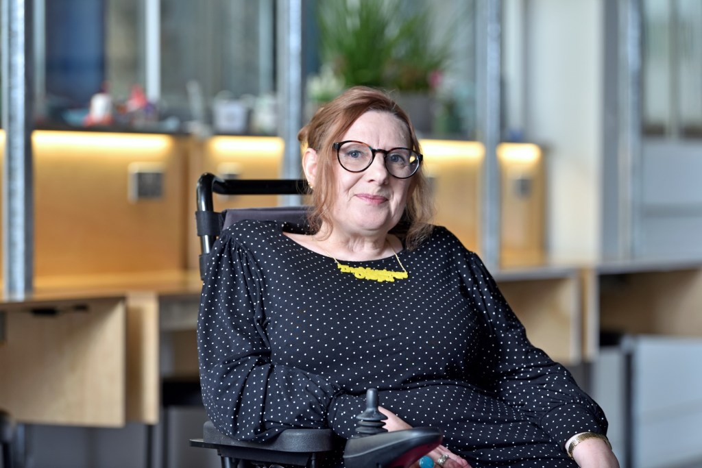 Alt Text: A photo of a white-skinned, middle-aged disabled lady, sitting in her electric wheelchair. She is wearing tortoise-shell glasses, a yellow necklace showing the slogan ‘The Musings of Spu’, silver rings & a black & white polkadot, long-sleeved top. Her hair which is coloured ginger / pink / brown is swept up in a large clip at the back. She is smiling. The photo was taken in a large teaching space but the background has been blurred.