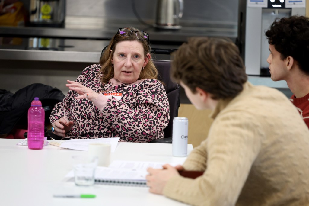 Alt Text: A middle-aged woman, sitting in an electric wheelchair, is at a table with two young, diverse students in a room. They are deep in discussion. There are notebooks, pens, papers, cups, glasses & water bottles strewn across the table. The background is blurred but there is an area for preparing food & drinks. The surfaces are all stainless steel.