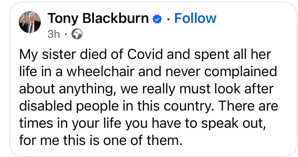 Alt text: A screenshot of a social media post from Tony Blackburn. There is a small, round photo of him in the left hand corner. He is an old man with grey hair, wearing a black suit jacket & tie, & a white shirt. He is holding up a medal & he is smiling. His post says ‘My sister died of [The Virus] & spent all her life in a wheelchair & she never complained about anything, we really must look after disabled people in this country. There are times in your life you have to speak out, for me this is one of them.’