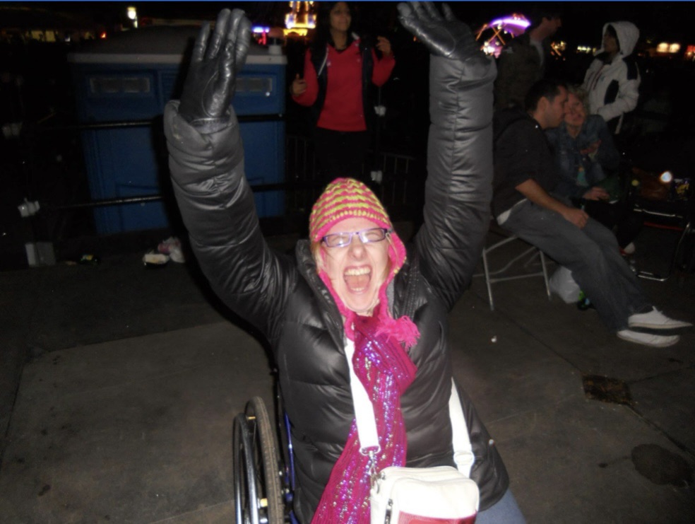 Alt Text: A white-skinned wheelchair user on a festival accessible viewing platform in the dark, with other fans standing & sitting on fold-up chairs around her. She is wearing purple glasses, a black puffa jacket, a pink, glittery scarf, black leather gloves, a woolly hat in pink & green, jeans & a white & red cross-body bag. Her eyes are closed & her mouth is open because she is shouting with joy. She raises her arms up into the air.