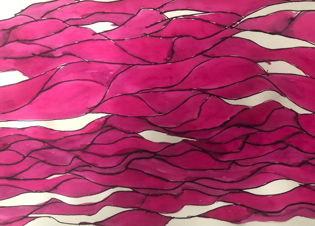 Alt Text: A pen & ink painting of shapes that resemble waves at sea. The waves are outlined in black & filled in pink. There are random spaces that have been left white to represent glimmers of hope.